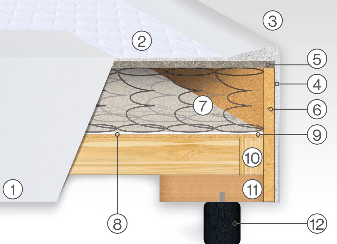 Jadro postele tvoria štvorvinuté 2,2 mm bonellové pružiny, ktoré zaistia vysokú nosnosť a dlhú životnosť postele. Povrch postele pokrýva špeciálne prešívaná tkanina, ktorá zabraňuje posúvaniu matraca. Hotelová posteľ Crystal ponúka komfort aj pre tých najnáročnejších hostí.
